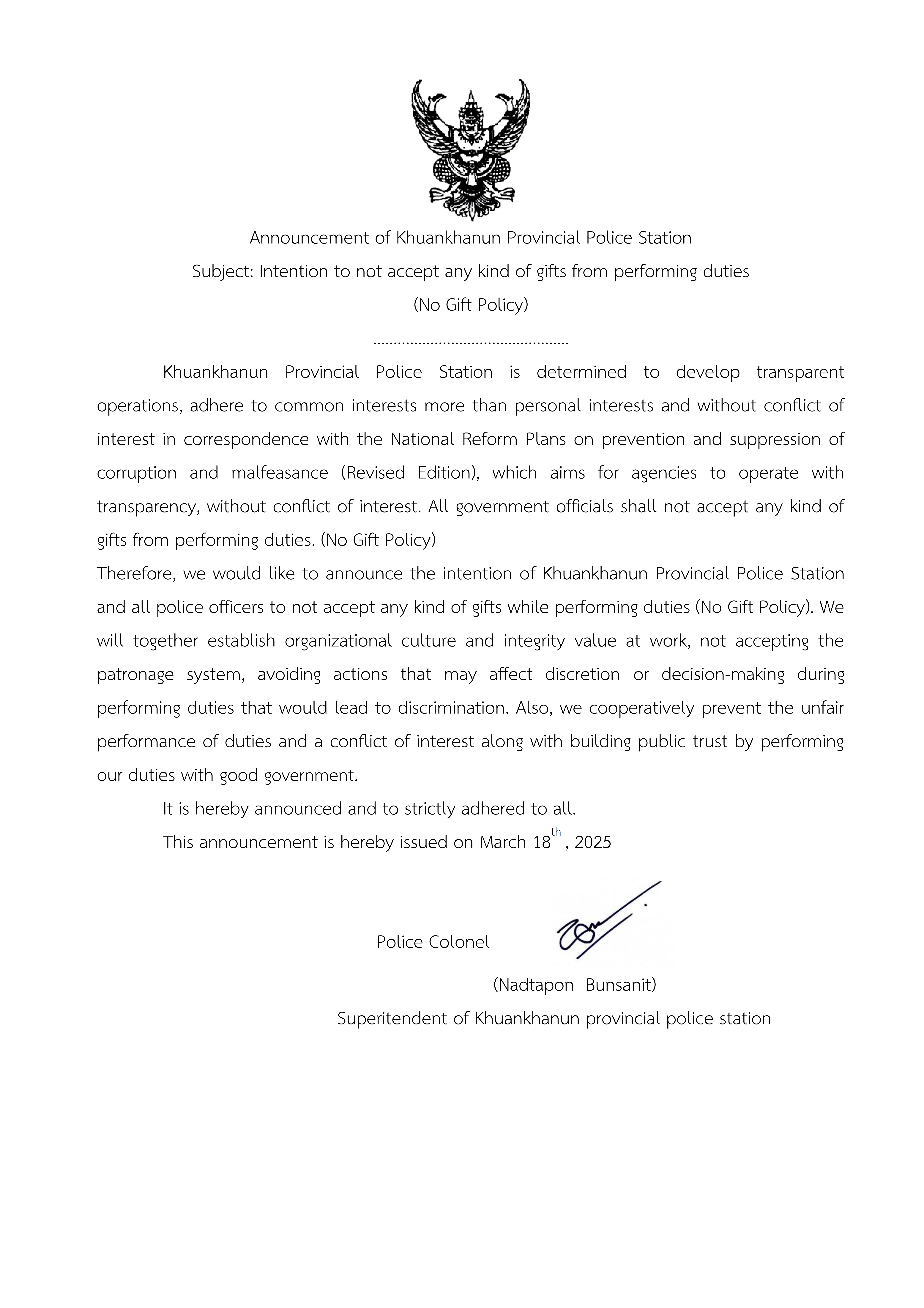 O18 ประกาศนโยบายต่อต้านการรับสินบน (Anti-Bribery Policy) และนโยบายไม่รับของขวัญและของกำนัลทุกชนิด (No Gift Policy) จากการปฏิบัติหน้าที่